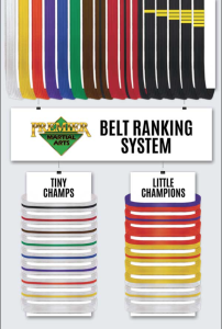 Belts are always earned, and never given or purchased. Below Black Belt testing happens every 3-6 months depending on the student, their program and their current belt level. Younger students in our Tiny Champs or Little Champs Program have a few more belts on their way to Black Belt to help them mature and learn at an appropriate pace for their ages.